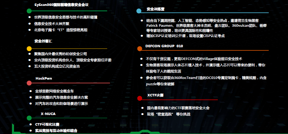 这四大安全会议各自有着风格不同的特色活动元素,如安全训练营、软硬件破解和CTF等黑客比赛,现场趣味黑客活动,安全企业产品展览,以及资本与初创企业的对接等。而ISC 2017大会将以上特色元素全部囊括,大会带来6大特色活动:SyScan360国际前瞻信息安全会议、安全创客汇、HackPwn、安全训练营、DEFCON GROUP 010以及XCTF决赛。