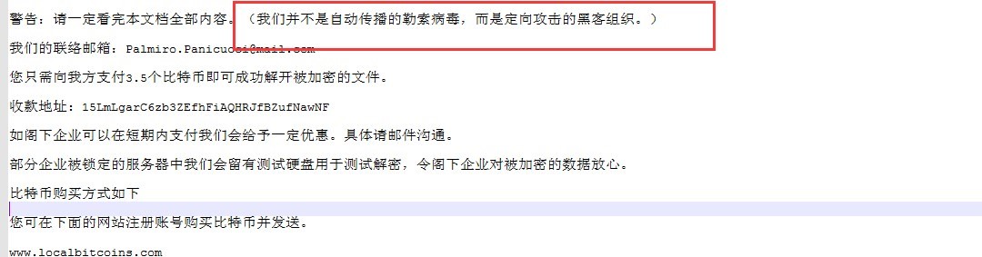 近期众多企业服务器发生勒索病毒攻击事件,被感染磁盘无法正常打开,服务器上的敏感资料面临巨大损失。病毒作者自称是“定向攻击的黑客组织”,毫不讳言其趁火打劫的企图,张口要价3.5个比特币(约人民币8万元)赎金,十分猖狂。