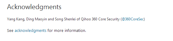 作为全球首家发现并向微软报告该漏洞细节的安全厂商,360安全团队在漏洞发现后紧急升级了热补丁,在官方补丁未发布前就实现了对该漏洞攻击的有效检测和防御。同时,360通过与微软安全团队的积极配合,火速推进了该漏洞补丁的发布,使其在发现一周内得以妥善修复。在官方公告中,微软对360的贡献进行了公开致谢。