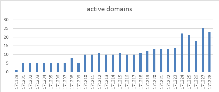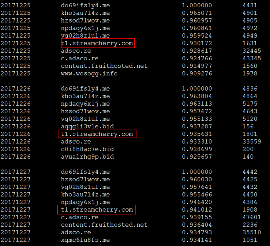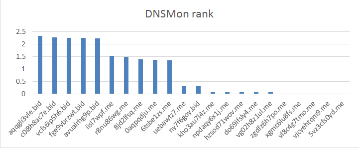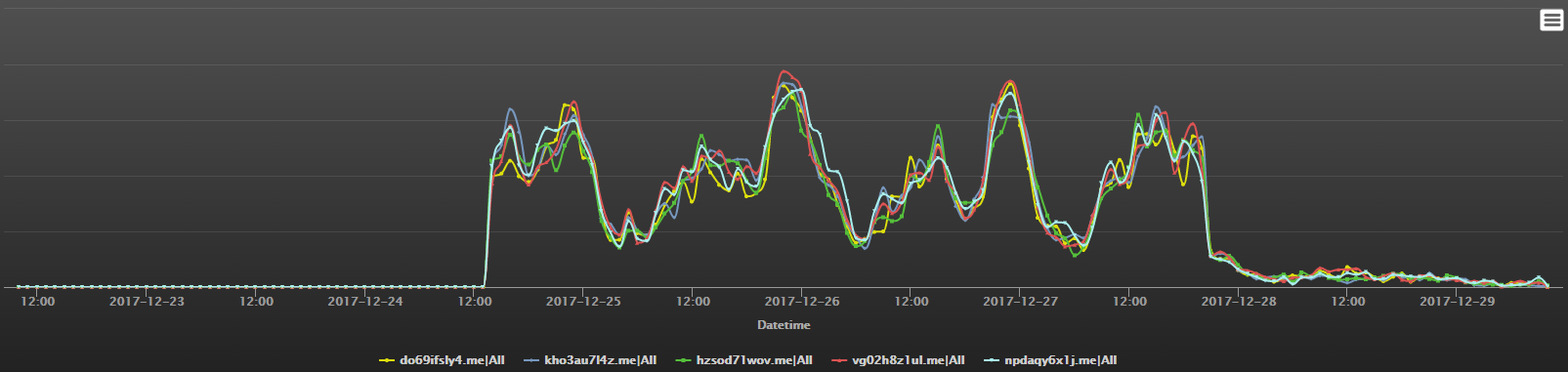 dnsmon 是我们的dns异常检测系统。在2017-12-24日,系统报告了一组域名的访问异常,这组域名和对应的访问曲线如下: