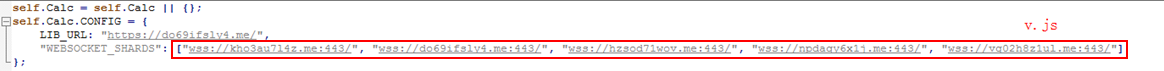 进一步的,可以观察到前述全部5个异常域名是对等的,均对外提供了 WebSocket服务。这个关联体现在 hxxps://do69ifsly4.me/v.js 中,在经过多轮次的解码去混淆后,可以找到如下代码片段