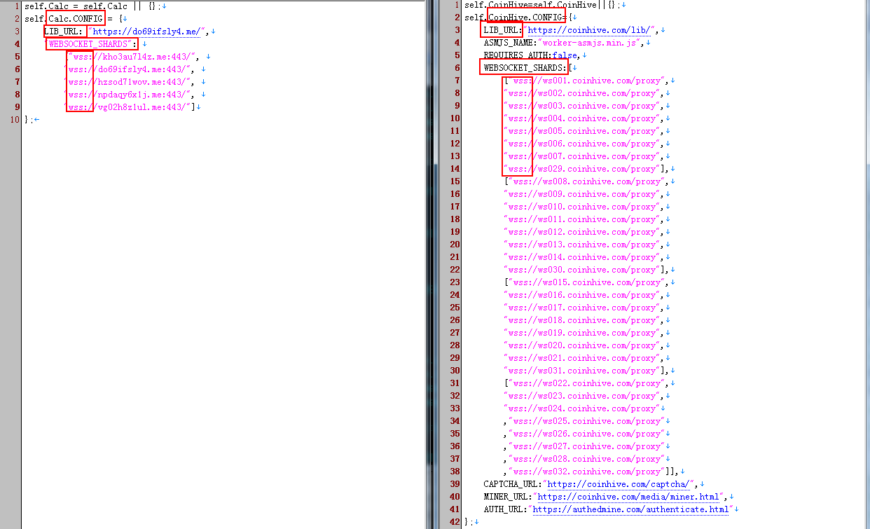 下图中js代码片段左侧来自streamcherry,右侧来自 CoinHive。在 CoinHive 的上下文中,这段代码是要指定挖矿代码上联的服务器地址。