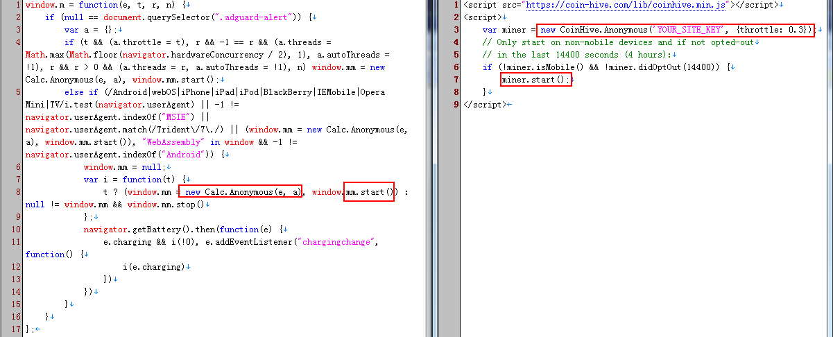 回来继续比较代码。下面这段代码是挖矿对象的创建和启动过程,两边的代码结构也是类似的。同样 streamcherry在左,CoinHive 在右。