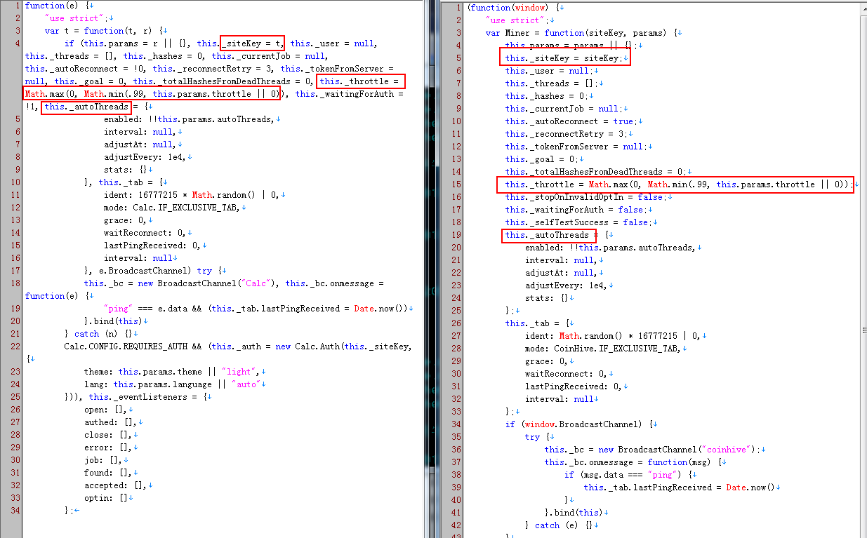 继续比较代码。下面这段是挖矿对象的内部实现,两边代码也是类似的,注意这里会涉及几个比较关键的属性列举如下。照例 streamcherry在左,CoinHive 在右。