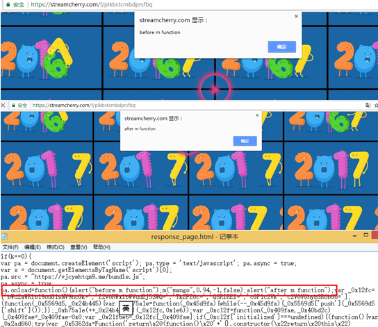 由于 streamcherry 调整CPU阈值,我们在浏览器中打开页面时,并不会感觉到明显的卡顿。为了确认上述代码的确会被执行,我们手工在 javascript 代码中挖矿对象被调用的前后加上弹窗告警。重新运行时,的确两个告警都会被运行,这证实了挖矿对象的确在运行。两个告警和手工调整的javascript代码如下:
