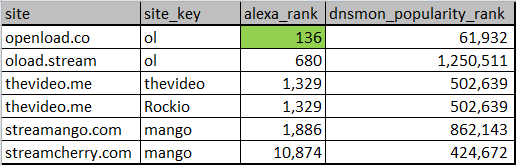 涉及使用上述挖矿服务的网站,包括openload.co,oload.stream,thevideo.me,streamcherry.com,streamango.com。其中,openload.co 网站的Alex排名为136,流行程度非常高,这意味着全球范围内有较多的终端用户算力会被攻击者攫取。