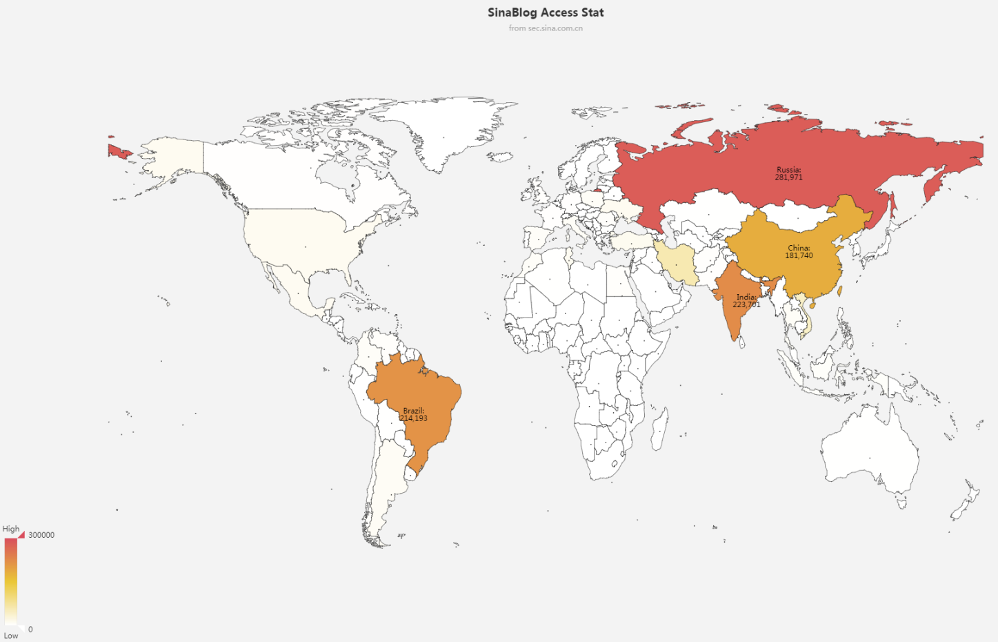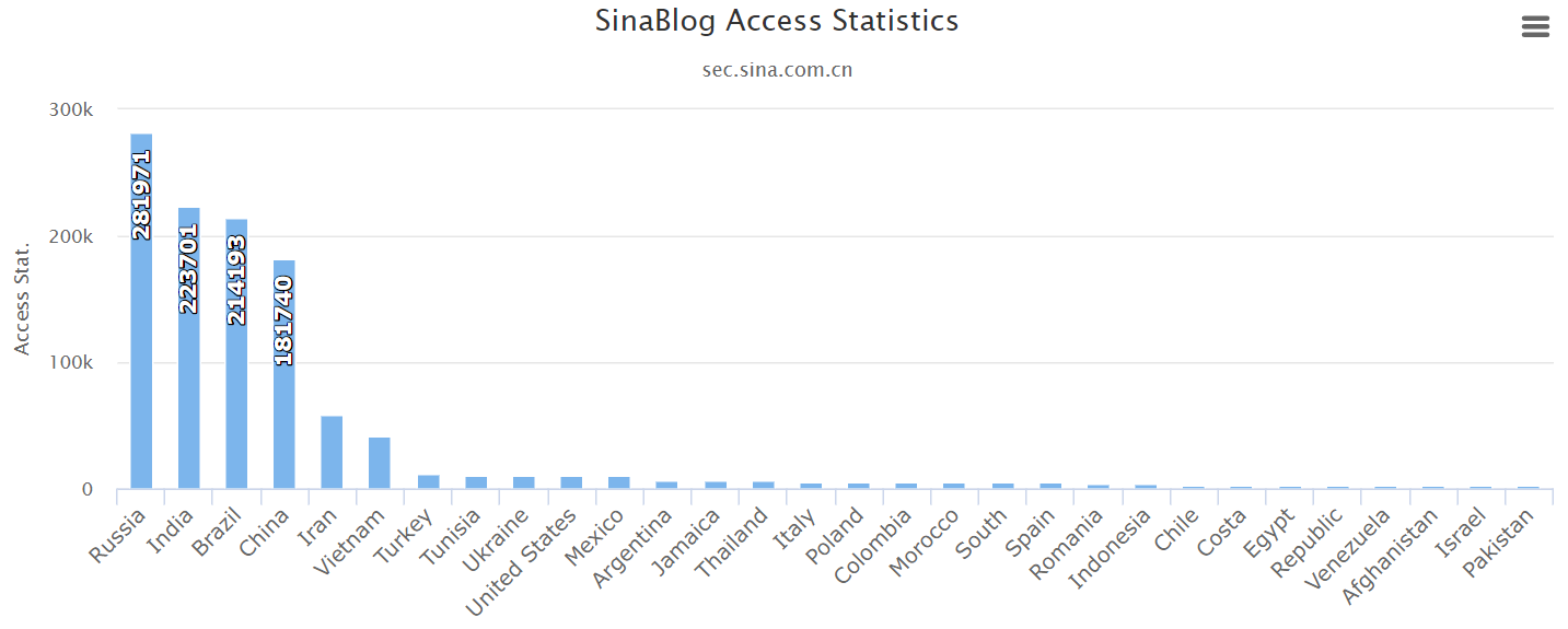 统计 2017 年 5 月底前述被关闭的上联 URL 的访问来源 IP 数可知,独立来源 IP 总数 1,183,911 个,分布在遍布全球 198 个国家和地区。其中来源 IP 超过 100,000 的国家和地区有四个,分别是俄罗斯、印度、巴西和中国。