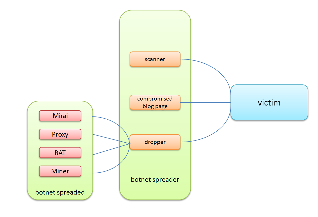 botnet.0 向后继僵尸网络提供的接入界面简明清晰,以至于从后继其他僵尸网络的角度来看,只需要按照接入界面要求配置安装包下载地址,以及安装包被下载后需要执行的脚本,安装包就会被下载执行。至于扫描和投入阶段的各种技术细节,可以交由 botnet.0 处理,自己完全不用关注。