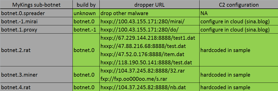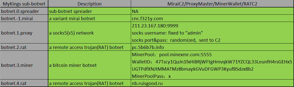 明确上述结构以后,使得我们可以将整个 MyKings 划分为多个子僵尸网络,并逐一标记各子僵尸网络的特征如下表: