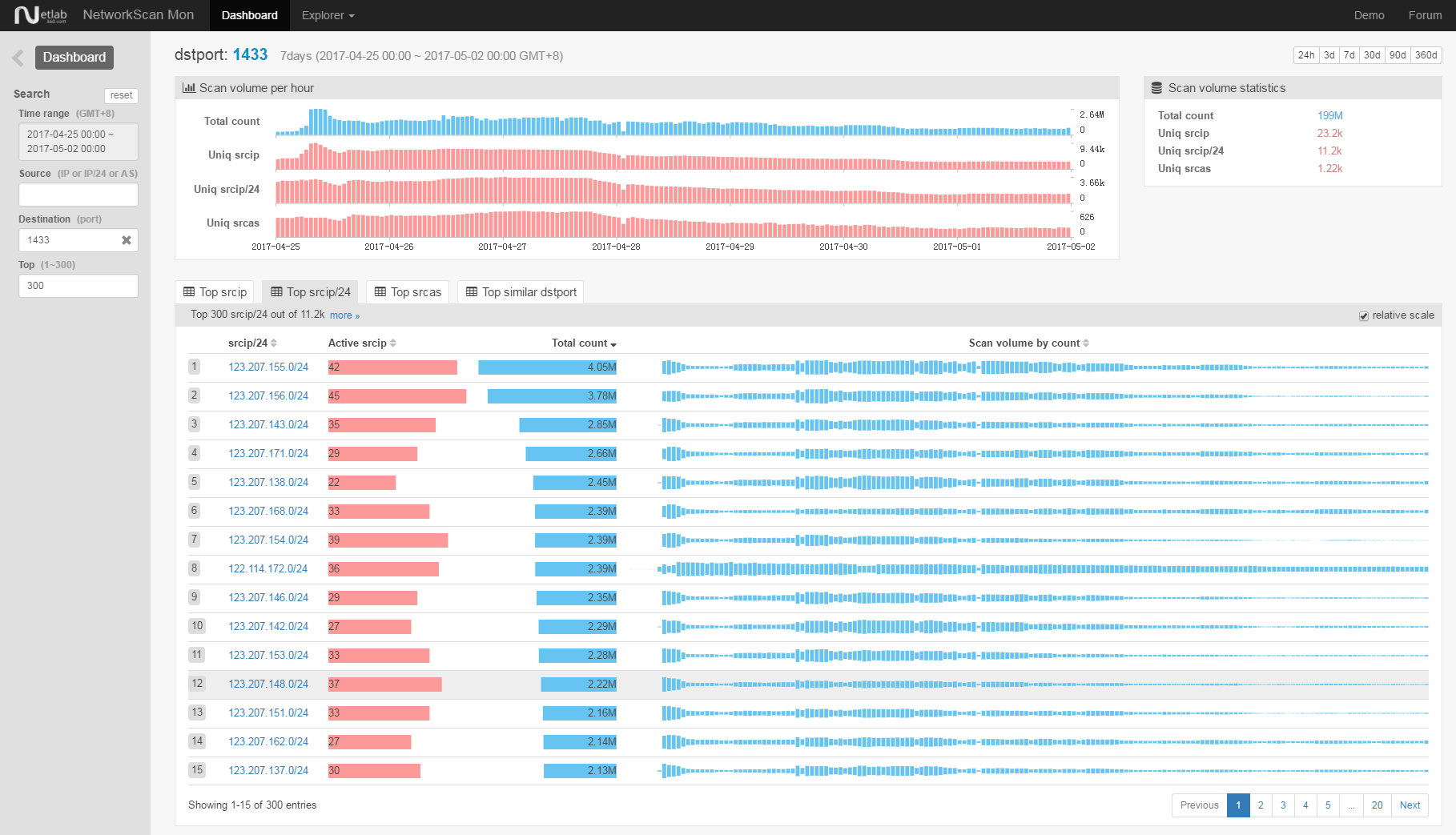 我们检测到上述主机集中发起扫描的时间在 2017.04.25 08:00:00 附近,当时在 scan.netlab.360.com 上能看到的 1433 端口的扫描情况如下。