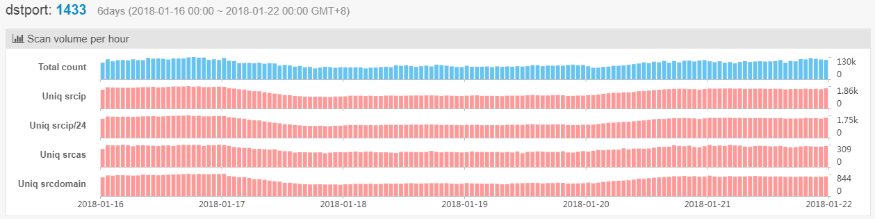 可以观察到当天上午8:00开始,1433端口上的扫描有了一个巨大的暴增。暴增前每日扫描事件约为5m/d,之后突增到30~40m/d。